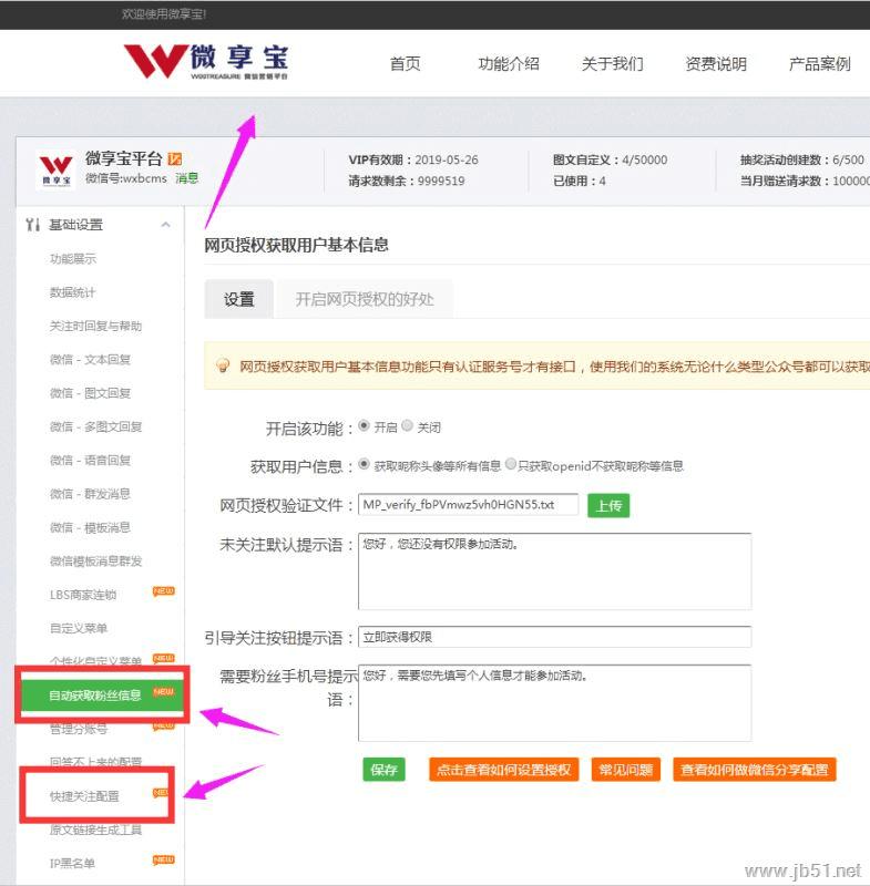 第二步:点击功能管理按钮进入到制作后台,点击左边基础设置里面的自动获取粉丝信息,选择获取头像和昵称,选择开启,保存。然后还是左边点击快捷关注配置,设置一下公众号的关注链接(就是公众号里群发过的任意图文链接地址),保存