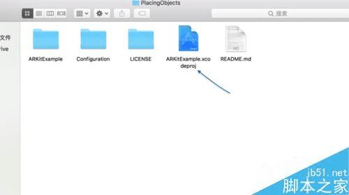 打开之前下载的 AR Demo App 目录,名为 PlacingObjects 的目录,可以看到有一个 Xcode 名为ARKitExample.xcodeproj 项目文件,双击打开即可。