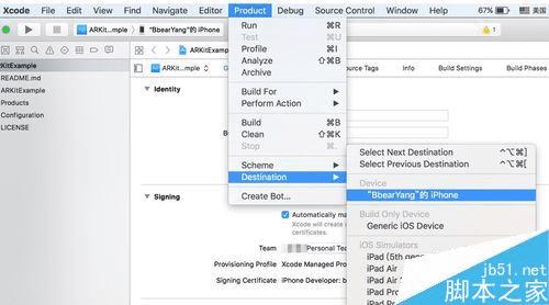 随后是选择把 AR Demo 应用安装的目标设备,通过点击菜单栏中的 Product 下的 Destination 子菜单,然后选择当前接入 Mac 设备,这里以个人的 iPhone 为例。