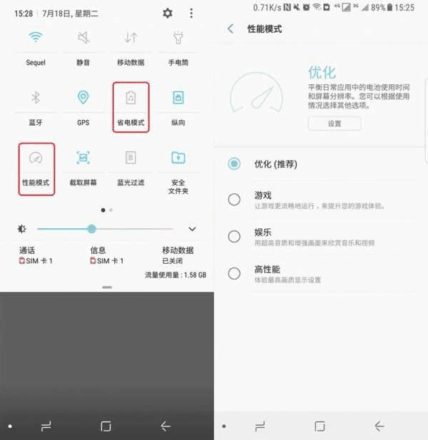 另外一方面,很多手机系统会有调节性能的选项,拿三星S8为例,下拉菜单中就有可以调节“性能模式”和“省电模式”的选项,在设置中也有更多对于性能的调节。