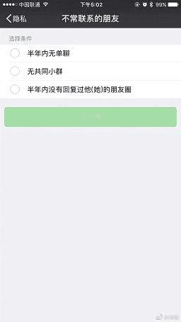 最新曝光的图片可以看出,该功能位于“隐私”条目下,与“通讯录黑名单”并列,而点开后有三种筛选条件:“半年内无单聊”、“无共同小群”以及“半年内没有回复过他(她)的朋友圈”。