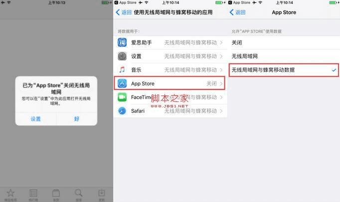 2、 如果打开App Store弹出的是“已为App Store 关闭无线网络”的提示,请点击“设置 - App Store – 无线局域网与蜂窝移动数据”