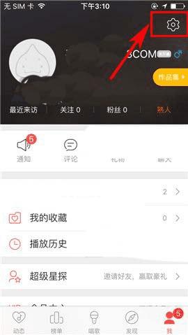 1)打开唱吧APP,首先点击首页右下方的【我】,然后再点击界面右上角的【设置】图标;(如下图)