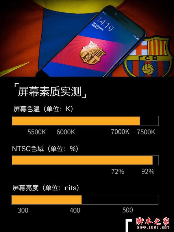 OPPOR11巴萨限量版的屏幕色温稍高,亮度高达410nits,在AMOLED屏幕中表现十分优异。色彩表现上,高达99.12%的NTSC色域也十分亮眼。