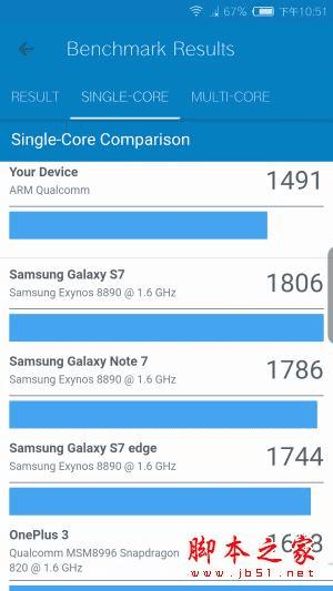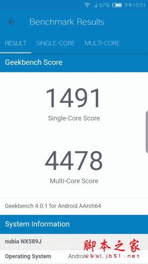 GeekBench是一款常见的跑分软件,努比亚Z17miniS所搭载的骁龙653处理器在测试中,单核得分为1491,多核得分4478。