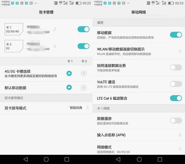 【注意】:插入两张SIM卡时,其中一个卡槽可支持移动/联通/电信的4G/3G/2G网络,而另一个卡槽仅支持移动/联通/电信的2G 网络(当一张卡为移动、联通4G时,另一张卡最高支持联通3G通话),但两张电信卡不能同时使用。