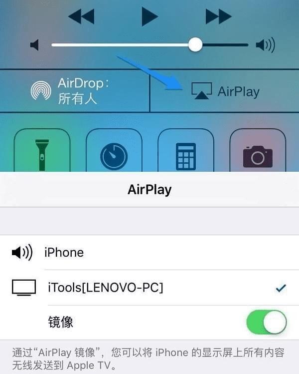 - 2.选择完系统后,您的iPhone控制中心就会出现"AirPlay"的标志。点击“AirPlay”,在跳出的界面中选择电脑标志的"itools",再将镜像开关打开。