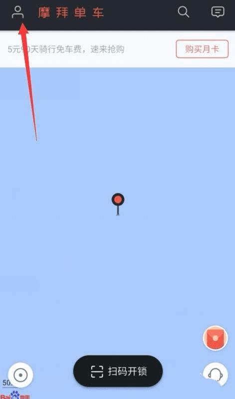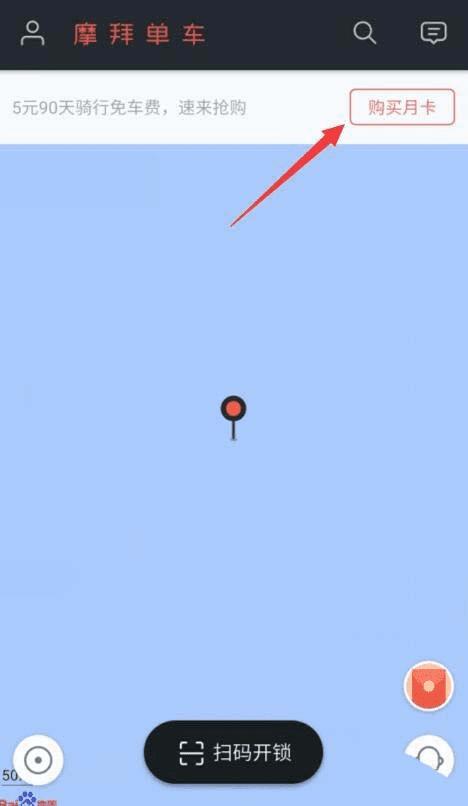 1、首先我们先打开摩拜共享单车客户端,打开之后会看到在面板顶部会有一个5月90天骑行免费的活动,此时我们单击“购买月卡”按钮。