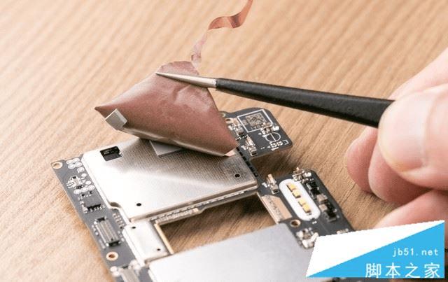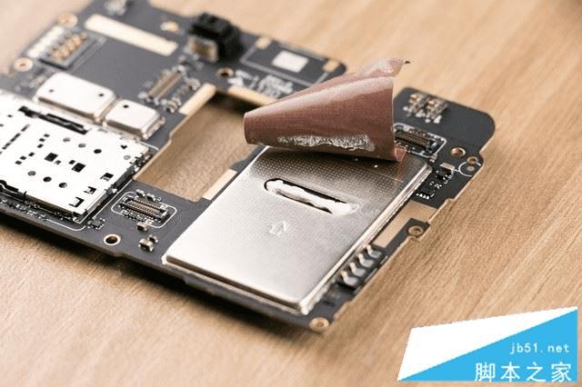 在主板背部屏蔽罩上同样贴有散热铜片,并且下面有一条散热硅脂,不难断定这里就是处理器芯片位置了,但由于屏蔽罩焊死在这里,所以我就不做进一步拆解了。但总体来看,该机芯片的散热设计还是很到位的,不光处理器,多颗核心芯片采用了散热硅脂,以及铜片的散热方式,主板的利用率以及芯片密度的表现不错。整体工艺相比同级别手机处于中上等水平。