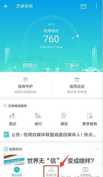 2、在芝麻信用页面里单击下方的“信用生活”按钮;