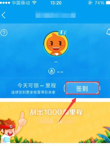 3、进入“领里程”页面后,在这里有两种方法可以获得里程。第一种是点击“签到”按键,签到之后就能获得里程了。第一天签到可以获得一个里程,第二天签到就能获得两个里程了,只要连续签到,往后获得的里程就会越来越多的。