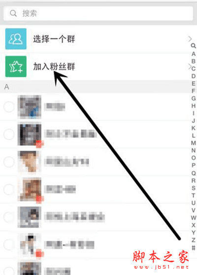 3、这时候会进入到一个选择联系人的列表,最上面就有一个选择一个群和加入粉丝群的选项,这里我们点击“加入粉丝群”这个选项。