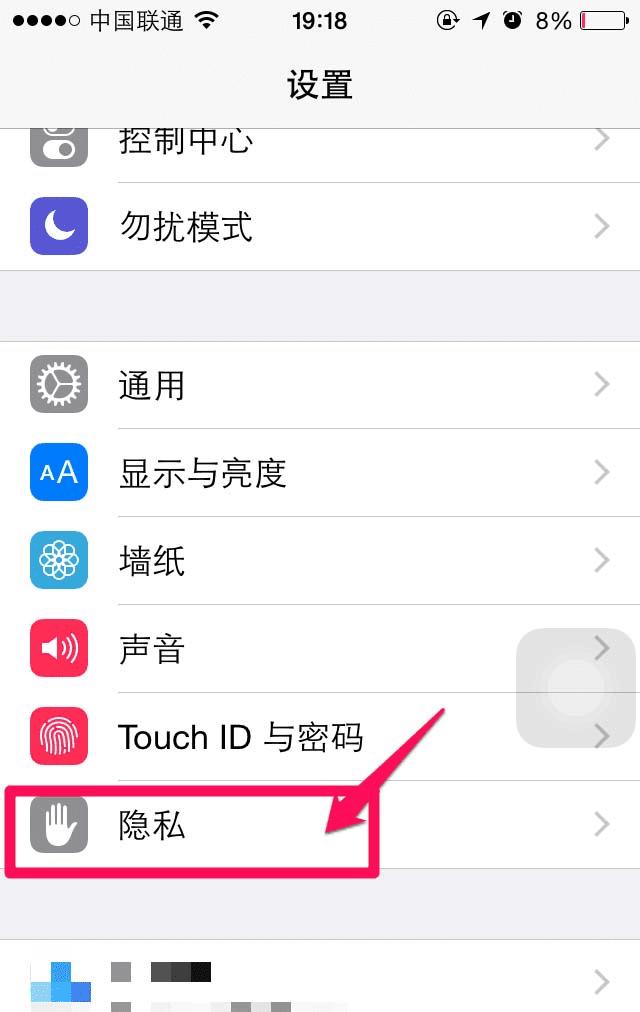 4、在手机设置,选择进入隐私。