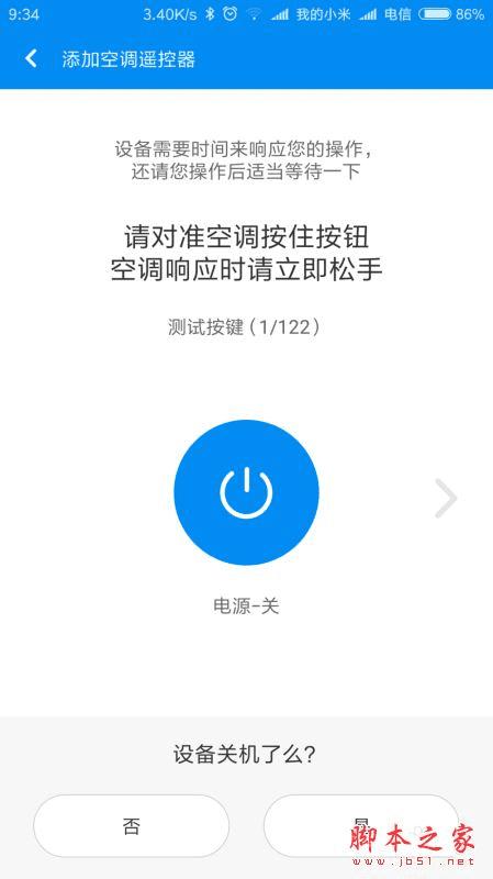 5、上面是空调开机的测试按键,下面就是电源关机的测试按键,和上面步骤差不多,按键按到空调有响应为止,然后点击是否关机;