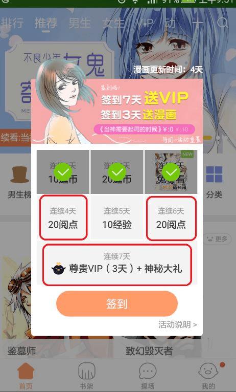 签到除了获得经验和逗币,也可以获得阅点,在连续签到第四天和第六天分别可以获得20阅点,第七天可以获得尊贵VIP和神秘大礼包。