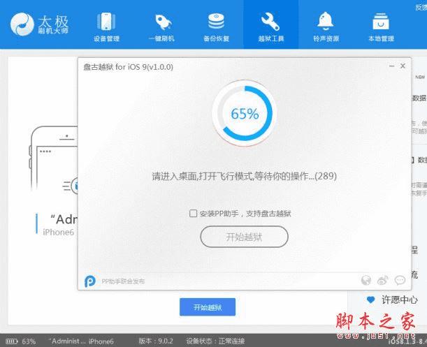 4、太极刷机大师越狱工具正在为设备进行越狱,当进行至提示“请打开飞行模式”时,请打开苹果设备的飞行模式,太极刷机大师越狱工具会继续越狱