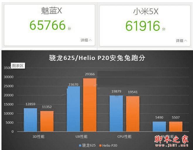 从安兔兔跑分测试来看,小米5X安兔兔总分61916分,魅蓝X总分65766分。显然,就性能而言,Helio P20相比骁龙625略胜一筹,只不过差距很校此外,骁龙625采用更先进一些的14nm工艺,在功耗上更低一些,细节上也有优势。