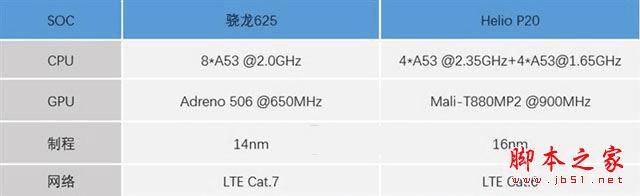 高通骁龙625和联发科Helio P20均为八核设计,两者采用的都是8核A53架构,其中骁龙625的8个核心主频都是2.0GHz,基于14nm工艺,GPU为Adreno 506@650Mhz;而联发科Helio P20则采用4高频加4低频设计,最高主频达到2.35GHz,基于16nm工艺,GPU为Mali-T880MP2@900Mhz。