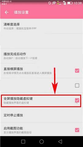 2)随后选择【播放设置】一栏,最后再勾丫全屏播放隐藏虚拟键】以开启该功能即可。(如下图)