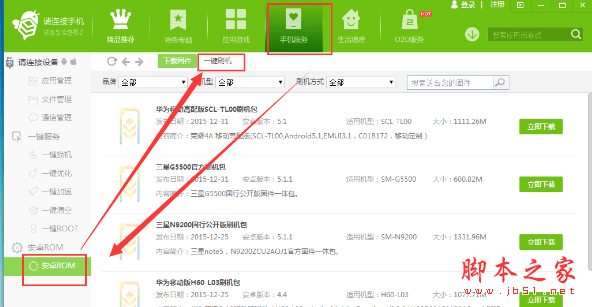 2、连接成功后我们在蜂助手的“手机服务”中打开“安卓ROM”,在“安卓ROM”中打开“一键刷机”;