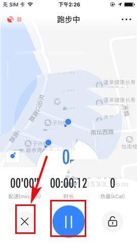 2)接着点击屏幕中箭头所指处的【开始】按键,最后在结束时再次点击该按钮并点击【x】键退出(或直接在结束时点击“x”按钮退出跑步模式)。(如下图)