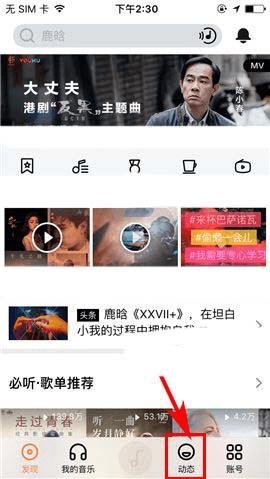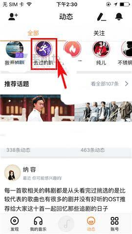 1)点开虾米音乐APP,首先进入首页下方的【动态】,随后点击【去过的趴】;(如下图)