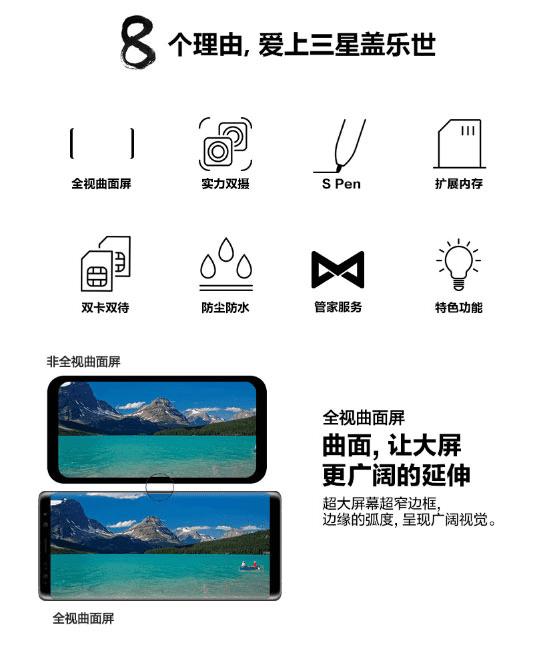 屏幕方面,全面屏已经是今年旗舰机的核心卖点,继苹果7全面屏之后, Note8成为三星第二款全面屏手机,配备6.3英寸2K分辨率全面屏,正面视觉效果惊艳。