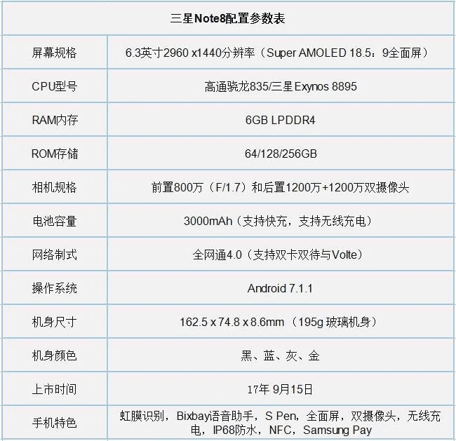 三星Note8作为三星的旗舰机,无论是外观、配置、特色功能等方面都非常出色,首先看一下三 星Note8的详细配置参数,如下图所示: