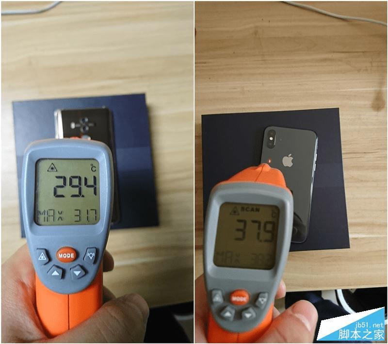 HUAWEI Mate 10 Pro机身最高温在30度左右,触感稍温,而iPhone X机身最高温在37度左右,已经能明显感觉到手机在发热。