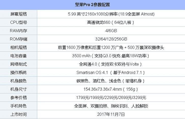 配置方面,坚果Pro2配备5.99英寸18:9全高清Almost全面屏,搭载高通骁龙660处理器,配备前置1600万和后置1200万广角 + 500 万景深双摄像头,运行贴心的Smartisan OS 4.1系统,以下是该机详细参数。