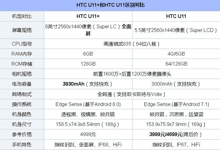 HTC U11+属于此前发布的U11旗舰机的全面屏版,设计上已经与一直以来的“大额头”和“大下巴完全不同。取而代之的是最近流行的全面屏,虽然没有采用iPhone X、小米MIX系列那种激进的全面屏设计,但是不影响U11+的美感十足。作为U11的全面屏升级版,首先来看看这两款手机在配置上有何不同,具体如下。
