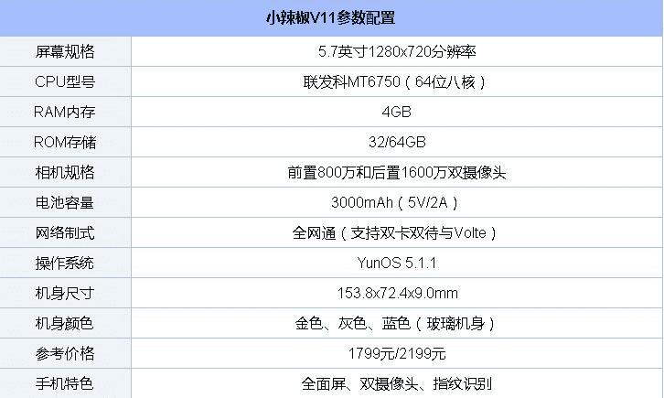 配置方面,小辣椒V11配备5.7英寸720P入门全面屏,搭载联发科MT6750八核处理器,提供前置800万和后置1600万广角+深景双摄像头,运行阿里云YunOS 5.1.1系统,以下是详细参数。