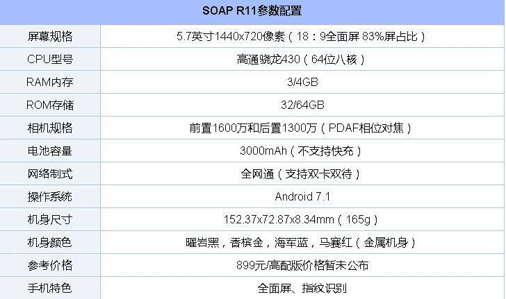 配置方面,SOAP R11配备5.7英寸720P入门高清全面屏,搭载高通骁龙430八核处理器,提供前置1600万和后置1300万组合,运行Android 系统,以下是详细参数。