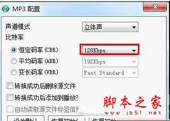 4.将比特率中的恒定码率改成较小的值,推荐128Kbps。