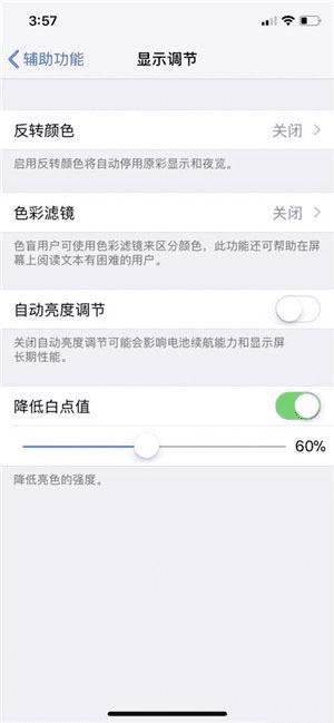 1、打开【设置】-【通用】-【辅助功能】-【显示调节】-【降低白点值】。