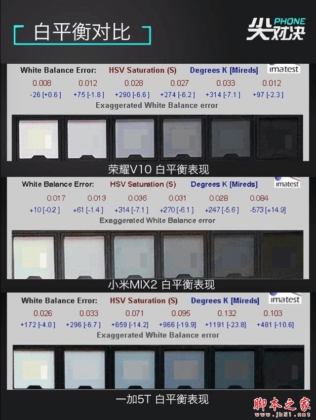 可以看到,色差ΔE的数据,同样是一加5T表现较好,也就是说,一加5T拍出来的照片颜色更接近真实的颜色。荣耀V10和小米MIX2都有着不同程度的调教,会显得浓艳一些。