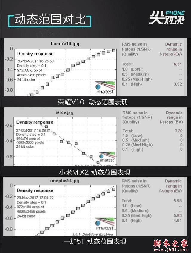 从动态范围的测试数据来看,荣耀V10表现最好,数据超过了6,达到了满分的水平,而一加5T也接近满分。但小米MIX2这一项表现较差,仅为3.32。也就是说在光暗反差较大的地方,小米MIX2丢失的细节会比较多。