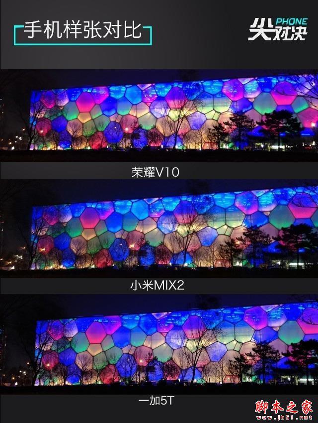 从实拍样张来看,在白天样张中,三款手机差别不大,小米MIX2稍有偏色。一加5T在夜景上表现最好,细节保留较多;在色彩上小米MIX2的颜色最淡,荣耀V10和一加5T颜色比较浓郁。
