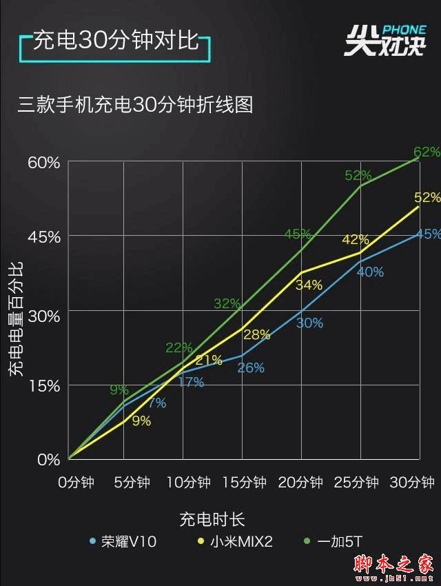 一加5T的充电速度还是令人满意的,Dash闪充在30分钟内就充进了62%的电量,而荣耀V10和小米MIX2的充电速度也都不差。