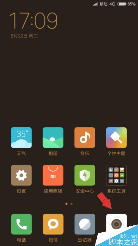 那怎么设置了。首先,解锁,在手机上找到相机,如下图箭头所示。