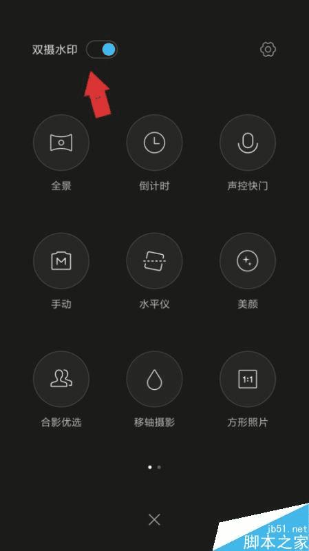 在弹出的界面顶端,如下图所示,可以看到“双摄水印”四个字,后面还有一个开关。你可以看到,此时双摄水印是打开的。