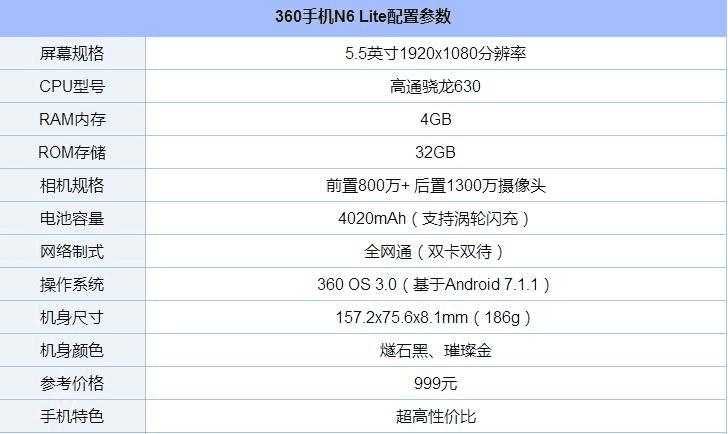 硬件配置方面360手机N6 Lite使用高通骁龙630处理器,这颗CPU也用在360手机N6上,核心频率为2.2GHz,另外提供4GB的LPDDR4X高速内存,并提供32GB的机身储存空间。另外360手机N6 Lite拥有后置1300万像素的摄像头,支持PDAF相位对焦极速,而前置摄像头800万像素,这些也是目前主流的配置,这些配置和360手机N6一致。屏幕方面使用5.5英寸1080P屏幕,并没有采用全面屏。系统方面配备最新的360 OS 3.0,基于安卓7.1.1底层,新加入万能扫一扫、相机助手、游戏加速器等等的黑科技。360手机N6 Lite配备4020mAh电池,也是一款主打大电池长续航的手机。