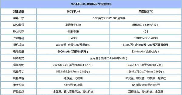 还是一贯的传统,首先我们还是直观的来看看360手机N6与荣耀畅玩7X的配置参数对比,如下表格所示。