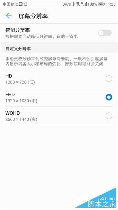 EMUI 8.0加入了智能分辨率功能,可以自动或者手动选择不同的分辨率,提高显示效果或者延长续航时间。