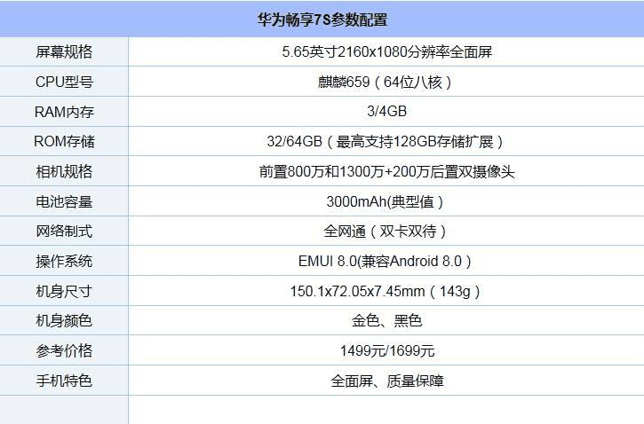性能方面,华为畅享7S搭载海思麒麟659八核处理器,内存上有3GB/4GB可选,存储容量也有32GB、64GB两种。