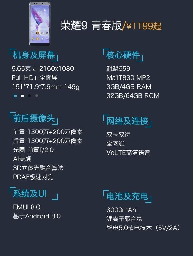北京时间2017年12月21日下午,华为举行新品发布会,发布新品荣耀9青春版,相对于今年上半年发布的荣耀9,采用5.65英寸18:9全面屏,搭载CPU主频2.36GHz的八核处理器,最高配备4GB+64GB存储组合,前后均配备1300万+200万像素双摄,最新的EMUI8.0操作系统以及针对城市生活的运动健康功能内置3000mAh电池,提供曜石黑、珠光白、魅海蓝、海鸥灰四色可选,,每个都代表着荣耀满满的诚意,售价1199起!