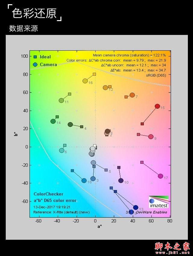 棚拍测试以标准光源D65环境下实际棚拍为依据,经过多次测试,通过Imatest测试软件进行测试,并对其各方面表现进行评分。系统建立于知名的数学运算平台Matalab,可靠性相当高,制图内容相当有深度。这里我们选用Imatest以及24色标准色卡以及灰阶测试图卡来量化测试机型棚拍样张的色彩还原、白平衡和动态范围。