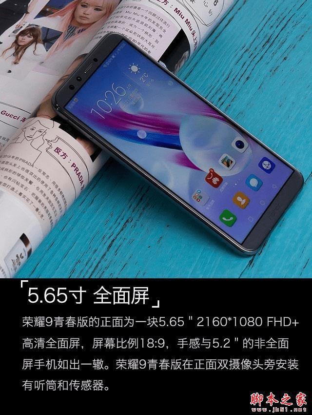 荣耀9青春版在正面双摄像头旁安装有听筒和感应器。由于采用全面屏的缘故,荣耀9青春版没有实体按键,机身下方为荣耀品牌的logo。荣耀9青春版的正面为一块5.65"2160*1080FHD+高清全面屏,屏幕比例18:9,手感与5.2"的非全面屏手机如出一辙。