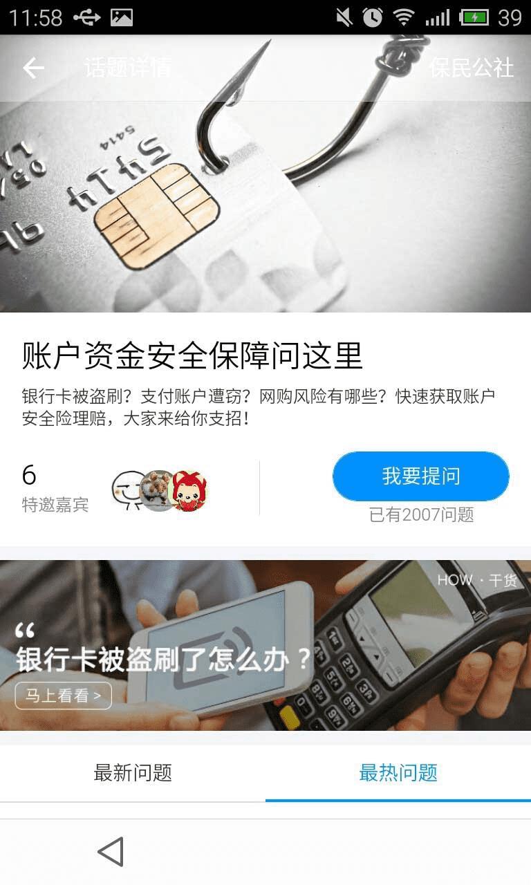 4、打开手机页面话题详情,账户安全保障问这里的界面会出现,可以自由的进行提问,有相关的支付宝的操作步骤可以在这里进行详细解读。