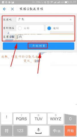 3)估完分数后我们就可以点击【查看志愿】了,最后填写完信息后点击【开始测算】系统会根据历史数据,模糊预估考生能够报考成功的学校了。PS:小编的考题都是乱填的,请不要在意这些细节。(如下图)